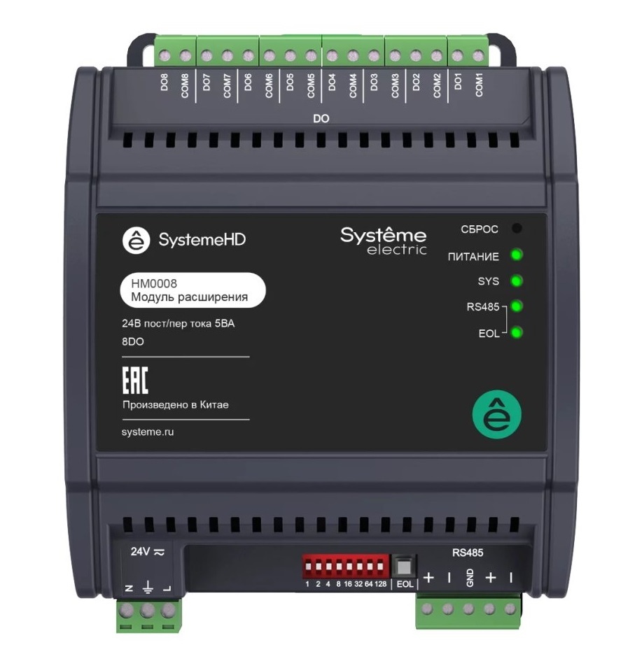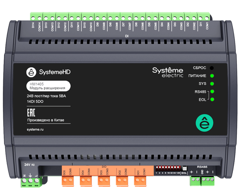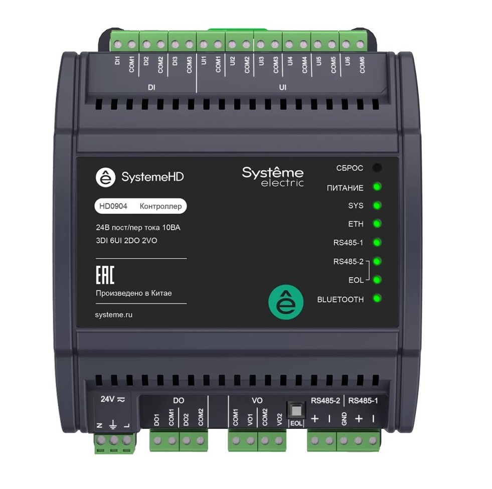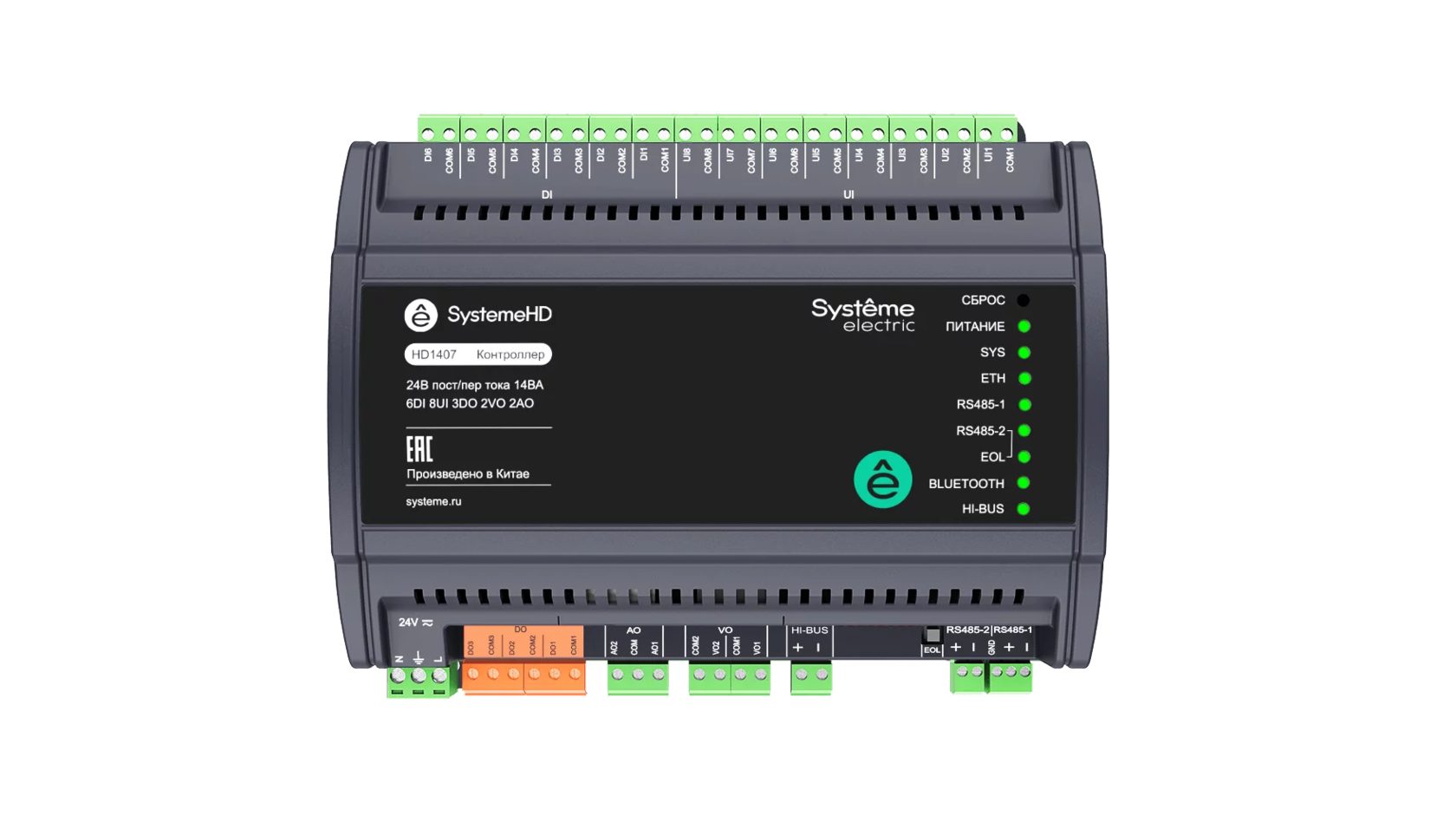 - Два или три порта RS-485 с поддержкой BACnet MS/TP и Modbus RTU для подключения периферийных устройств, таких как комбинированные датчики, комнатные термостаты, панели ЧМИ, преобразователи частоты